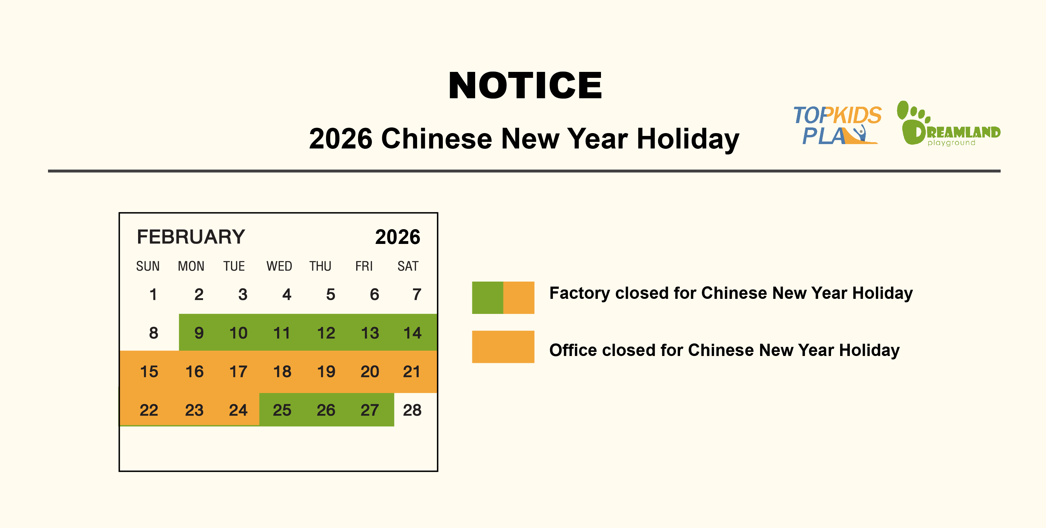 Factory (production): Please note that the factory will be closed from 9th to 27th February.